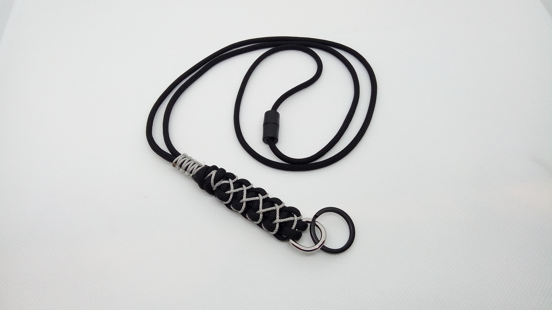 Lanyard feito à mão em paracord 550 com costura e acabamento em microcord.