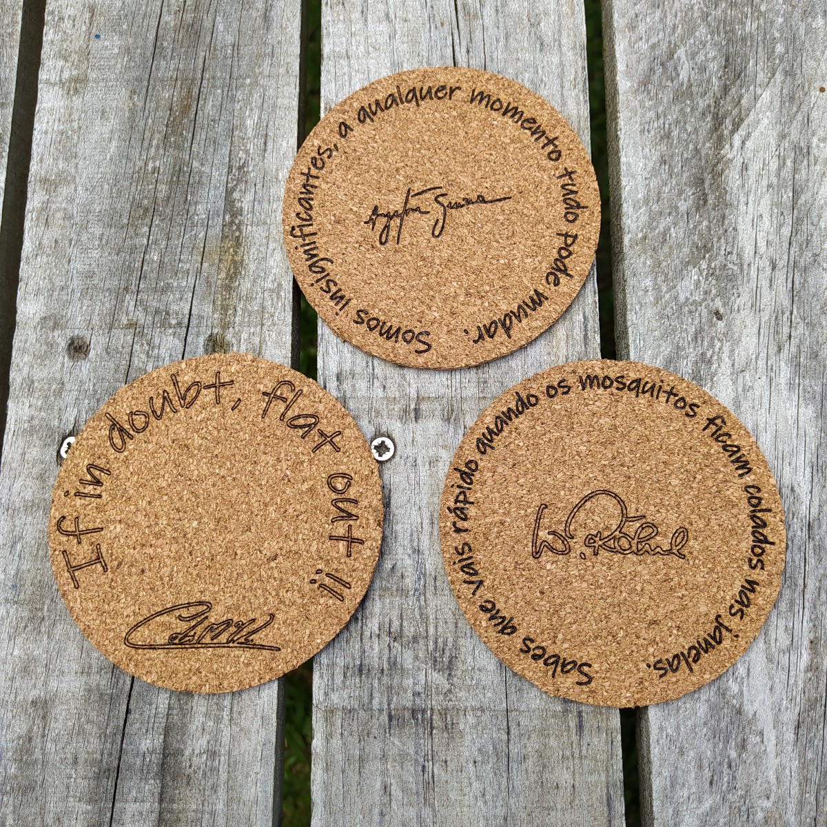 Além de proteger as superfícies, estes pousa copos em cortiça, dão um toque especial ao momento por serem personalizáveis com o texto ao teu gosto.