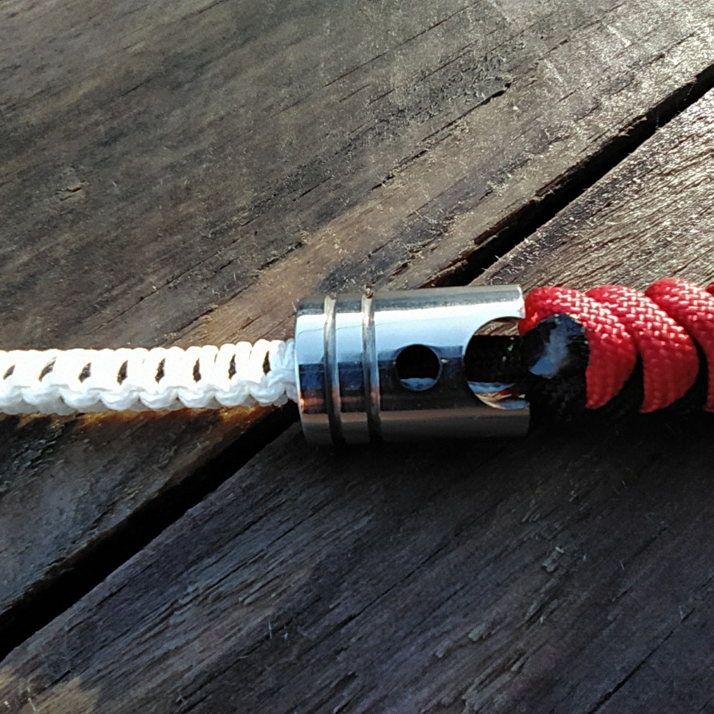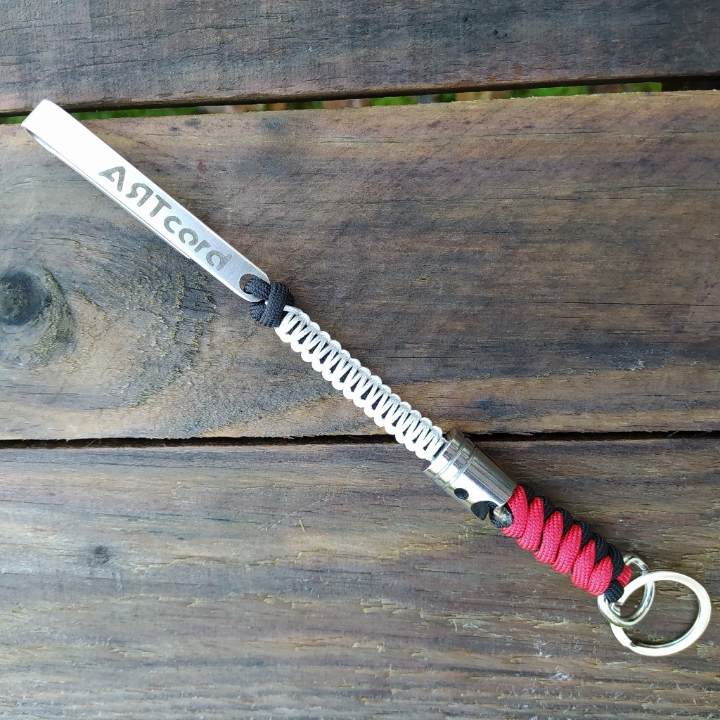 Porta chaves com as cores da equipa Porsche Motorsport em paracord 550, costura em microcord, pistão e clip de cinto em aço inoxidável.